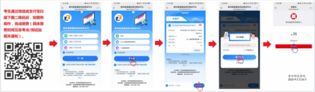 发表时间:2025-04-14 14:47 一、报名 网站:“360浏览器”极速模式或“谷歌浏览器”地址栏输网址“bm.cltt.org”进入。 收费标准:中学生15元/人次、大中专学生20元/人次、教师35元/人次、其他人员50元/人次。 注意事项: 1.报名对象:本校师生及社会考生。 2.考生首次报名,须用手机号注册后刷新网页,获取最新测试时间(注: 再次报名用注册手机号直接登录即可)。 上传资料:学生报名请选择学生,上传学信网下载学籍证明。 教师报名请选择教师,上传教师证或工作证扫描件。 其他人员报名请根据工作性质选择,上传身份证正面照,以便核实身份。 (注:本校考生所在单位填写贵州财经大学,考生院系填写学生所属学院,校外考生所在单位填写校外人员,所在院系无需填写) 3.信息审核:在审核期间4月23日-4月27日报名结束前登录“bm.cltt.org”报名网查看审核结果,未按照规定上传资料则审核不通过并不予以修改。(因个人没有在规定时间内查看审核结果导致报名不成功的后果自负) 4.缴费方式:报名成功后考生可通过“贵州省普通话培训测试中心”微信公众号上的缴费链接缴纳,或通过微信或支付宝扫描下图二维码后按图例操作完成缴费(注意缴费时间节点)。请于2025年4月28日下午15:00-5月6日以前缴费,5月6日24:00以后缴费系统将关闭,缴费成功后按时打印“准考证”并认真阅读。(缴费咨询电话:0851-88635364/88635367)咨询时间:2025年4月28日-5月6日,工作日早上9:00-下午16:00。