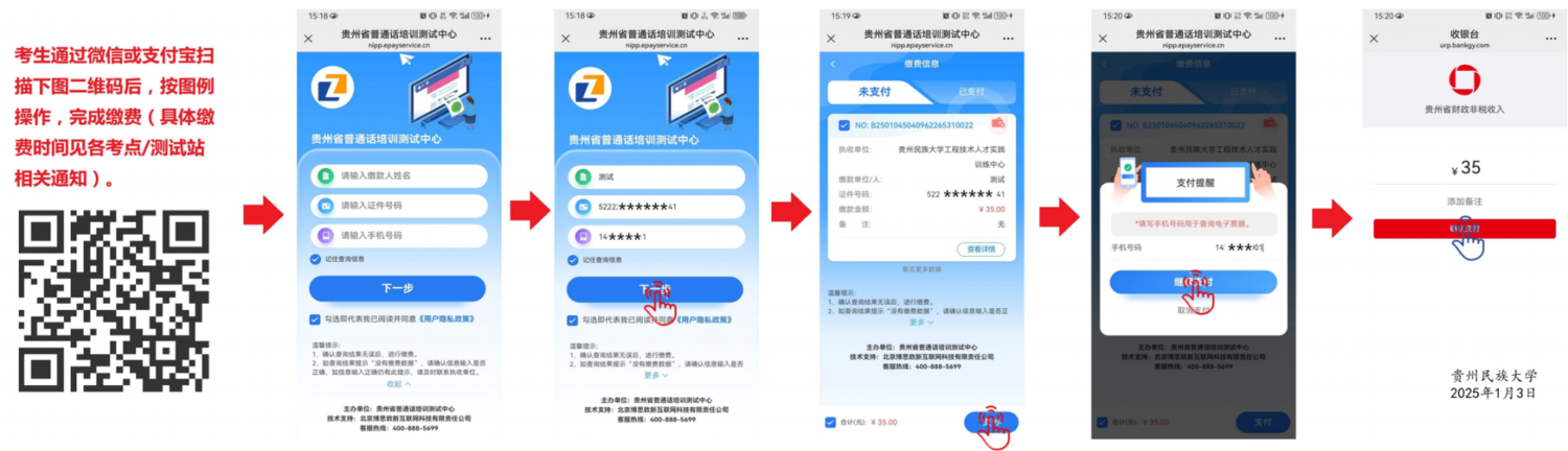 发表时间:2025-05-22 14:09来源:贵州农业职业学院普通话水平测试站 一、报名 1.报名网站:“360浏览器”极速模式,“谷歌浏览器”地址栏输网址“bm.cltt.org”注册选择贵州农业职业学院报名。 2.报名流程:报名时须准确填写姓名,身份证号,手机号,职业,并上传以下资料:身份证正面照 学生证(学生)/教师证(工作证)扫描件(教师),以便审核身份(未有学生证或教师证按社会人员身份报名)。审核期间请及时关注审核结果,确认无误后扫码缴纳测试费(注:缴费二维码附后)或通过关注“贵州省普通话培训测试中心”微信公众号缴费。 3.收费标准:中学生15元/人次、大中专学生20元/人次、教师35元/人次、其他人员50元/人次。 二、测试 1.测试日期:6月7日,6月14日。 2.测试地点:贵州(清镇)职教城乡愁校区黄柿路3号贵州农业职业学院3号实训楼2楼。 3.测试量:每场350人,共700人。 4.报名时间:5月22日开始预报名,预报名后5-7日内在报名网站关注审核结果。如审核未通过,可更新个人资料报下一场次。 5.缴费时间:审核通过后2025年6月3日开始缴费。 6.打印准考证时间:测试前三天。 三、注意事项: 1.报名对象:学院师生,其他应接受或自愿接受测试的人员。 2.因考试容量有限,采取“先报先得、报满为止”的原则接受考生报名。 3.测试缴费方式附后。 4.报名并缴费成功后,请在测试前一天内打印“准考证”并认真阅读。 5.缴费结束后,考生如因自身原因无法在当天参加测试,不予退费。 6.报名,缴费如有问题可电话咨询13158097013。 7.测试内容可参考语文出版社出版的《普通话水平测试应试指导》。 四、声明 请考生务必通过正规渠道报名,切勿相信任何“代报名”“内部名额”“包考包过”等谣言,以免上当受骗。 五、成绩查询及证书领取 (一)成绩查询:测试结束30个工作日,请自行上网http://www.gzyywz.net(贵州语言文字网)查询测试成绩,具体成绩公布以贵州语言文字网公布为准。 (二)证书领取:测试结束45个工作日后,具体领取时间以省普通话水平培训测试中心证书发放到普通话测试点时间为准。 1.领取时间:每学期开始后周五下午13:00--16:00,国家法定节假日休息。 2.领取地址:贵州(清镇)职教城乡愁校区黄柿路3号贵州农业职业学院3号实训楼2楼。 贵州农业职业学院普通话水平测试站 2025年5月22日 附:报名缴费方式如下 ![]() |